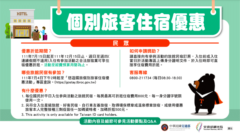 2022國旅補助申請完整方案,全臺國旅補助一次看,這樣領省1500(此篇已過期) 22 7 月, 2022 • yangirene168 分享: 2022國旅補助7/15正式登場!今年觀光局「悠遊國旅補助」方案,針對自由行、團體旅遊、遊樂園等觀光產業補助,像是旅遊團每團最高旅遊補助3萬元、遊樂園門票打3折,還有針對自由行住宿補助每晚最高1,300元,希望可以藉著國旅補助振興國內旅遊景氣,悠遊國旅補助活動時間從7月15日至12月15日,活動到經費預算用完為止,呼籲大家一起使用補助過暑假吧! 悠遊國旅補助 申請時間 2022/7/15~2022/12/15,平日適用。國旅補助平日定義:週日至週四,活動至經費預算用罄為止。 悠遊國旅 旅遊補助方案內容 悠遊國旅 自由行住宿補助申請 優惠方式 平日入住的民眾,每房最高可折抵住宿費用800元!另外,入住星級旅館、好客民宿、自行車友善旅宿、取得環保標章或溫泉標章旅宿,或使用優惠旅客本人完整接種三劑疫苗任一加碼資格者,加碼折抵500元,一共1300元! 國旅補助申請網站 國旅補助如何申請?民眾向有參與國旅補助活動的旅館民宿訂房,入住前或入住當日於活動專區上傳身分證明文件,於入住時即可享住宿費用折抵。(每一個身份證字號限使用一次) 自由行住宿補助申請 悠遊國旅 遊樂園補助申請 優惠方式 限平日使用(不含例假日及休園日),自由行遊客享有遊樂園各票種3折的優惠。 預約方式 為配合「安心遊園」政策目標,落實無接觸入園措施,可先上「悠遊國旅-3折遊樂園」活動網站預約,即可立即獲得3折優惠QRCode,入園當天持行動裝置出示預約訂單上的QRCode,即可於遊樂園現場購票享優惠,單筆最多可同時申請10個名額。 悠遊國旅-3折遊樂園 預約網址 國旅補助遊樂園名單 留言討論 (0) 最新排序 最新排序 最早排序 最多點讚 此文章的留言功能已關閉 評論 (0)