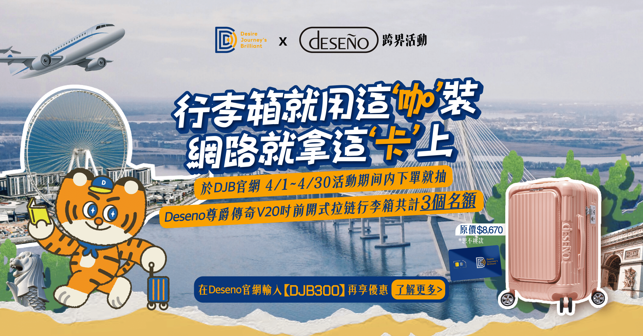 【活動方式與獎項】:活動期間內只要下單DJB 網卡,即可享有「 Deseno 尊爵傳奇V 20吋 前開式拉鍊行李箱」共計3個抽獎名額!