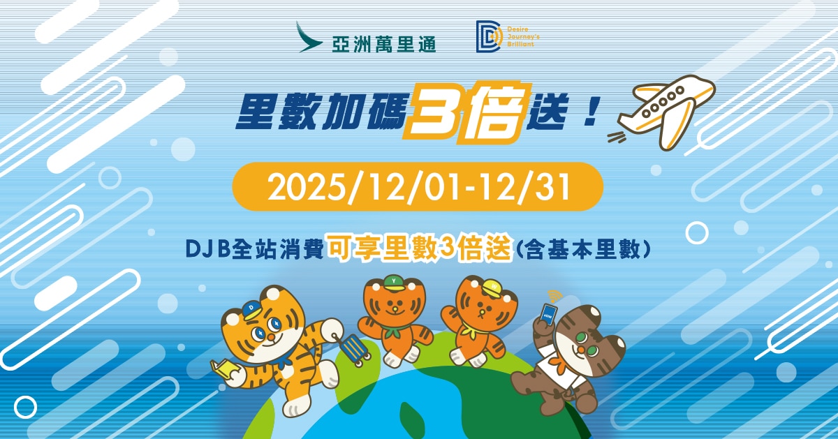 凡於活動期間於 DJB 全站消費,即可享有 3 倍里數回饋(含基本里數),輕鬆累積、暢遊全球!