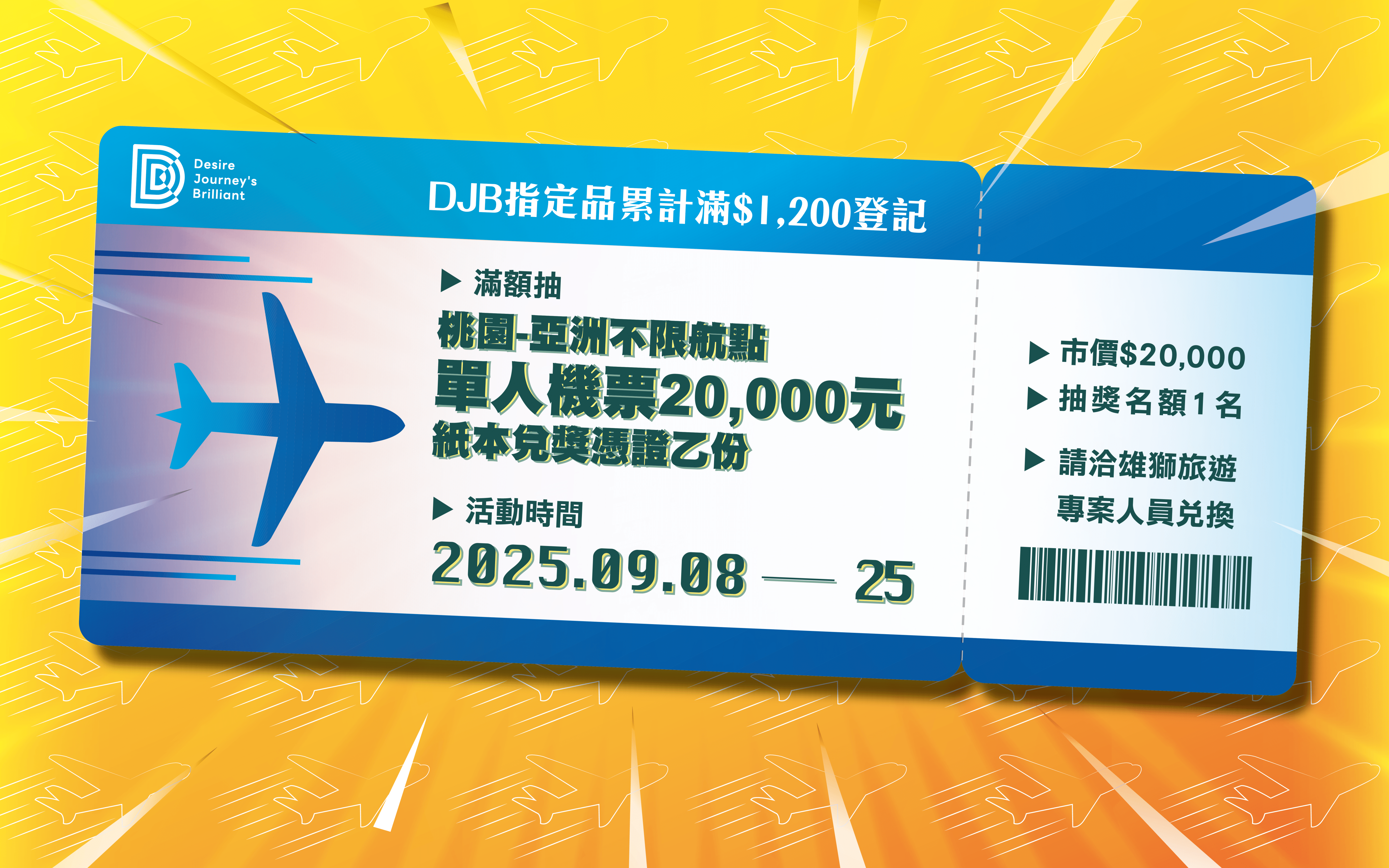 想要來趟說走就走的亞洲旅行嗎?現在機會來了!活動期間內於 PChome的DJB品牌旗艦館,消費滿 $1,200,就有機會參加抽獎,把價值 $20,000 的機票兌換憑證帶回家!