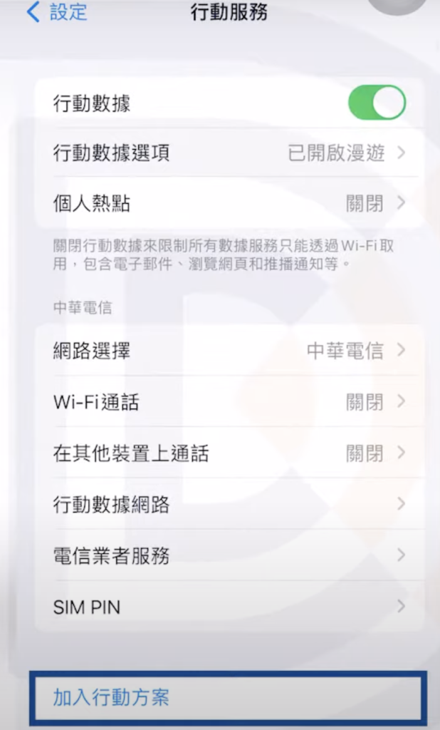 Step2:回主畫面——點選設定——行動服務——加入行動方案——掃描email中的QRcode(可以事先截圖傳給別人或是使用另外一台裝置開啟)——加入新的行動方案