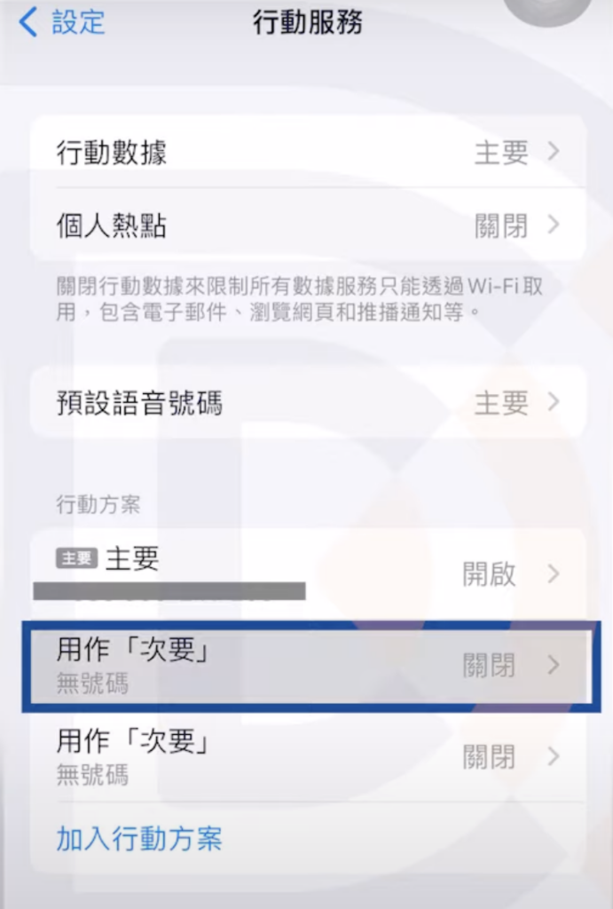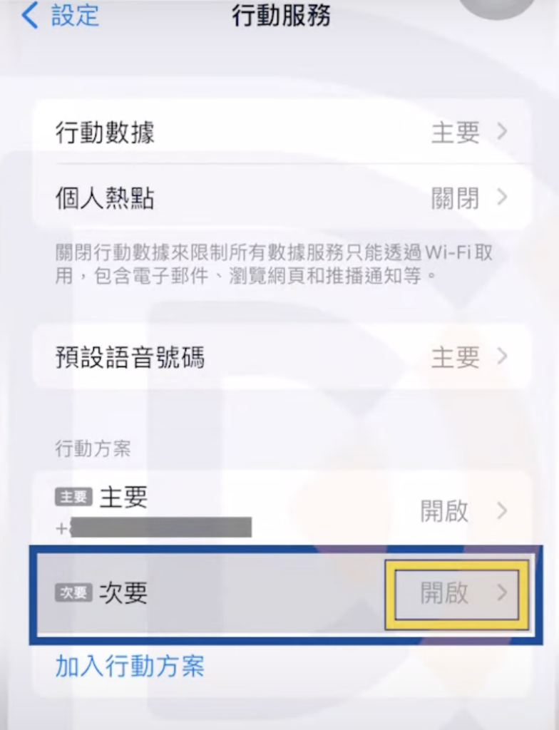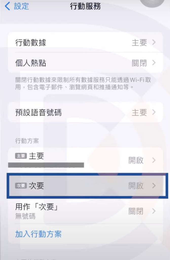 Step4:加入行動服務——將新增的行動方案由預設的標籤改為次要,也可自訂標籤(可視個人習慣設定名稱)勾選主要(預設號碼)——勾選主要(iMessage&FaceTime)——勾選主要(行動數據)——完成