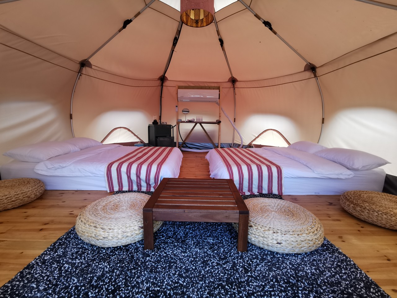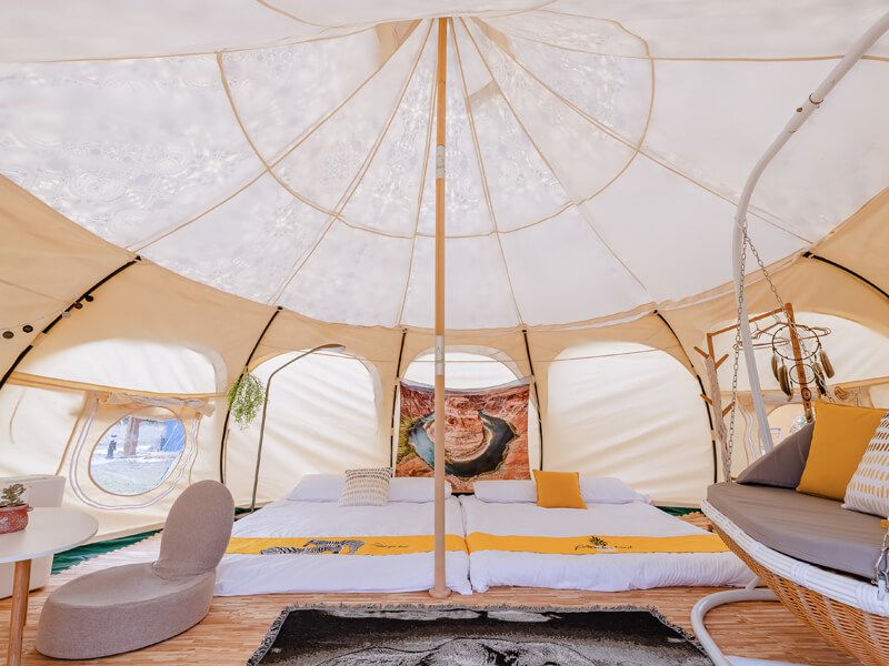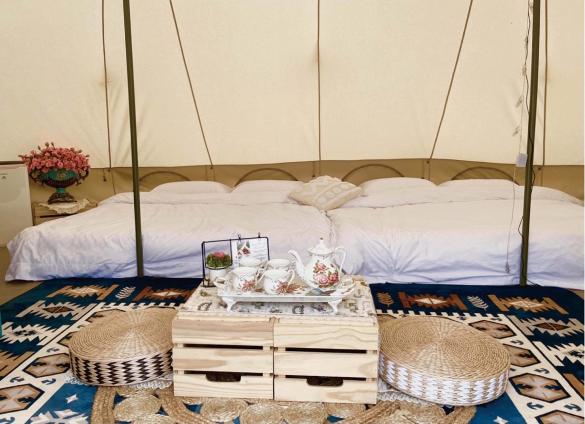 南投「入樹。村 」位於南投縣魚池鄉,村內提供雙人和四人的神殿帳,帳內內部空間寬敞,波西米亞風的設計具有美感,帳篷外設置奢華的露營桌椅、燈串布置等,大大增添了豪華露營的夢幻感,而且還可以攜帶毛小孩入住,每帳最多2隻,標榜寵物友善露營,讓毛小孩也可以跟者主人一起享受被群山環繞的幸福。如果想擁有更獨立的空間,村內另外提供兩台四人露營車,但就不能攜帶寵物了,不過車內卻有獨立的衛浴設備,不用和大家一起搶公共衛浴,算是滿極致的享受,夜晚更可以一起坐在大自然戶外下,觀賞露天星空電影院,悠閒愜望著星空看一部電影。