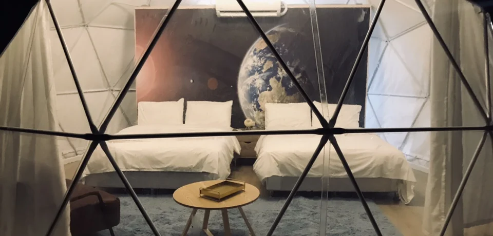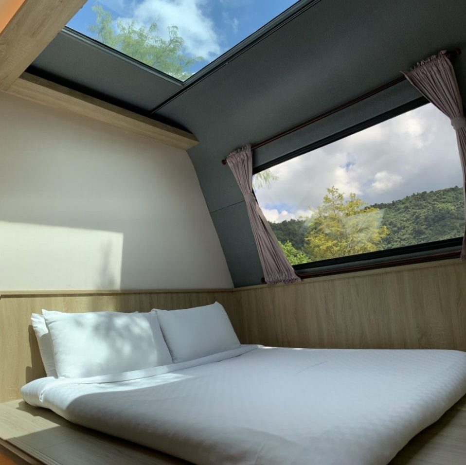 豪華露營最耳熟能知的就是帳篷不然就是露營車,還想得到什麼嗎?位於嘉義阿里山上的「Hamoana 星空帳篷」夢幻玻璃屋,三角形尖頂的設計,在夜晚星空下多麽耀眼突兀!但物以稀為貴,有錢還不一定能住得到,因為只有兩間,而且因為在網路人氣太夯,時常客滿,所以儘早確認好住宿日期就要毫不猶豫趕快訂房囉!住進夢幻玻璃屋有一種住飯店的享受,冷暖氣、電扇、冰箱等設備一應俱全,獨立衛浴甚至還有浴缸讓旅人可以享受在森林下泡湯的體驗。深夜的時候不妨將房內的燈關掉,加上沒有其他光害的環境下,搞不好還能看見整片星空一起陪伴入眠呢!