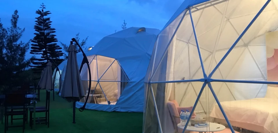 台東海邊舟舟∣曉晴星空露營地,營區帳篷分為三層:頂層-超廣角無敵海景星空帳、中層-高級海景星空帳、底層-海景第一排星空帳,帳篷不同於一般的狩獵帳、蓮花帳,它的外觀是非常夢幻的圓頂星空帳篷,每個房間內都有冷暖空調&65吋網路電視,也有獨立淋浴跟廁所空間(毛巾、備品均備),每一帳的帳外均有專屬烤肉桌、搖椅及大陽傘,夜晚可以坐在搖椅上抬頭仰望星空,親朋好友大家一起在大自然裡烤肉,夜晚的嬉鬧聊天聲就是最美妙的聲音,清晨起床還可以享受絕美海景和日出,小編認真覺得值得呀!!!