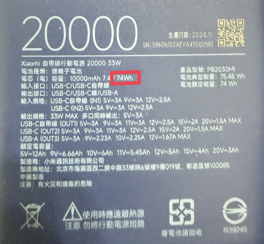 行動電源需留意是否有清楚標示Wh (如下圖紅框處)