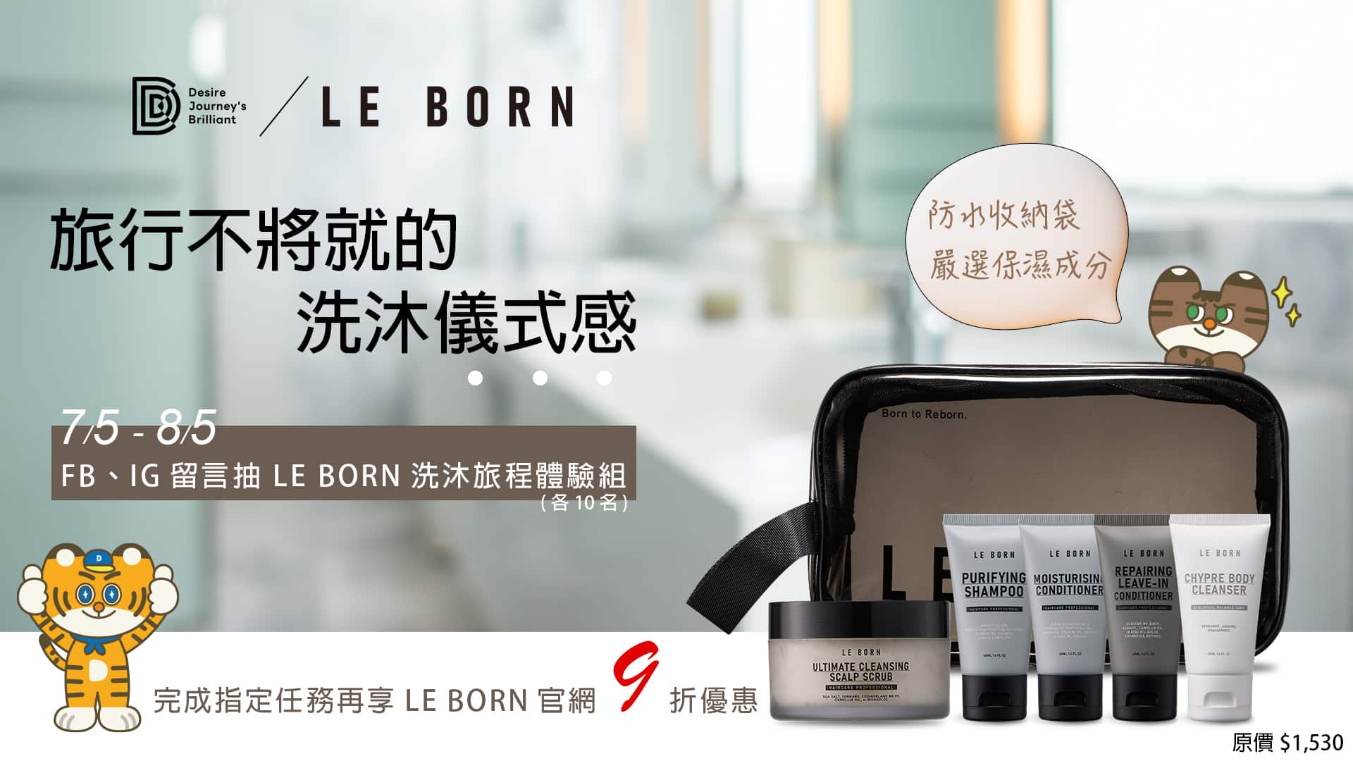我們將於FB與IG各抽出10位幸運粉絲,贈送 LE BORN 洗沐旅程體驗組乙組(市值 NT$1,530)