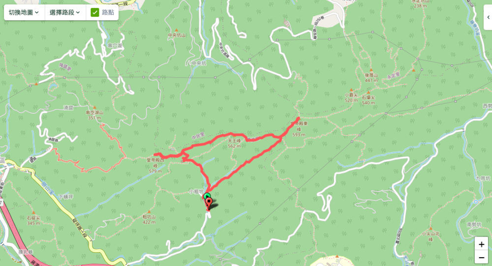 - 皇帝殿登山飲料站(西峰登山口) -> 天王廟 -> 皇帝殿西峰 -> 天王峰 -> 皇帝殿東峰 -> 東峰登山口