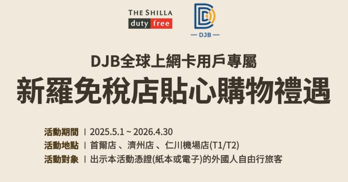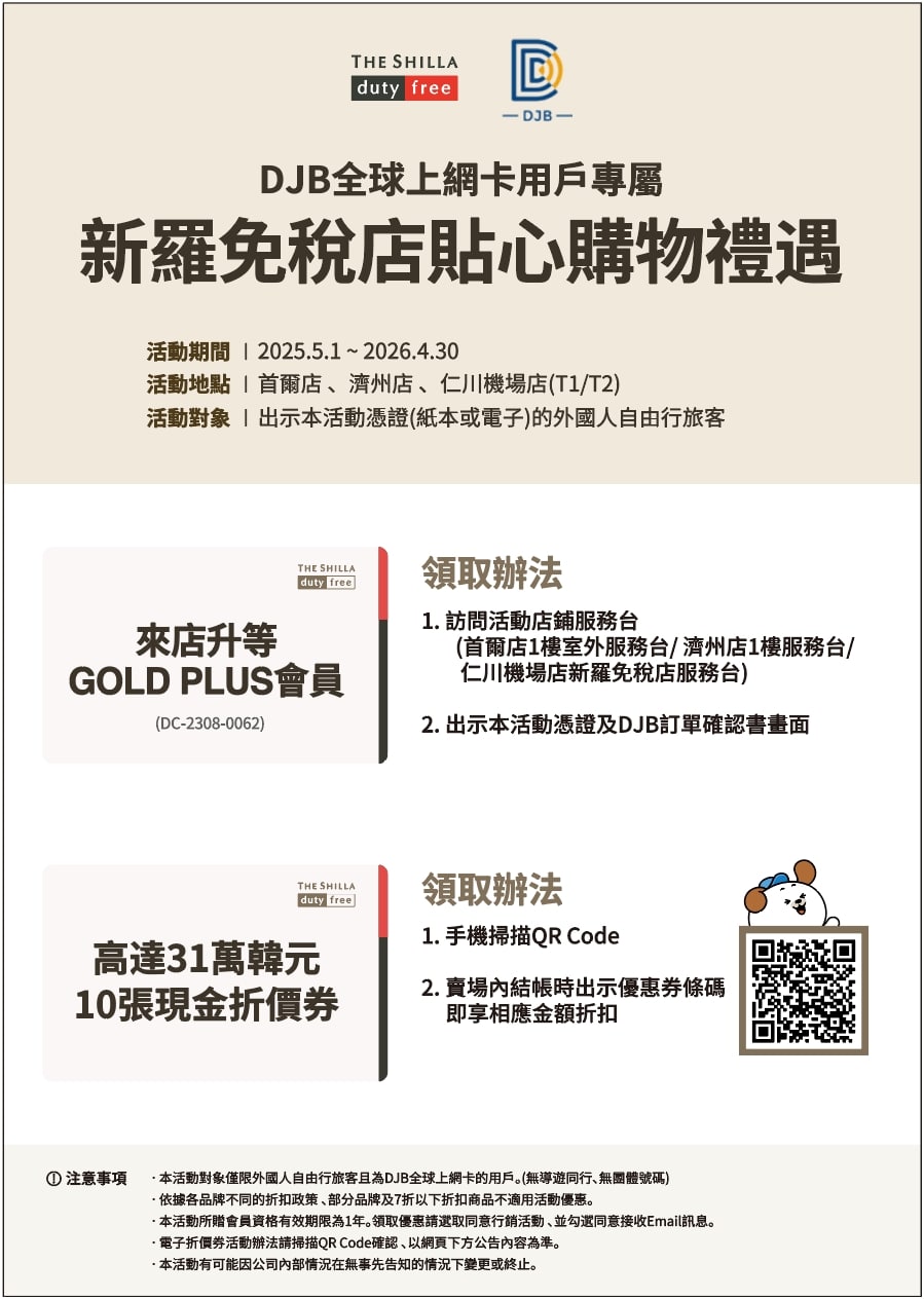 要前往韓國自由行的朋友們好消息來囉!DJB全球上網卡不僅提供日本購物的優惠券之外,如今與韓國三大免稅店巨頭之一的「新羅免稅店」,在2023年終於敲碗合作啦!新羅免稅店在首爾、濟州以及仁川機場三地提供前往韓國的旅客獨家購物優惠,2025/5/1至2026年4月30日止,凡是出示旅客本人護照及專用活動憑證,除可享有10張滿額現金折價券之外,再出示DJB訂單確認信頁面,還能免費升等Gold Plus會員一年,可同時享用Gold Plus會員優惠和滿額現金折價券,這樣的優惠是不是非常划算啊!推薦給即將要來韓國自由行的朋友人手一張優惠券,買越多省越多!還有小編特別提醒,要來消費前,時不時注意一下新羅免稅店官網資訊,會有意想不到的驚喜等著你唷!