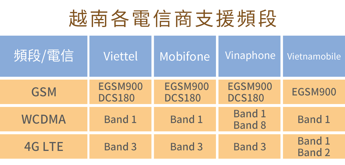 越南的 2G 和 3G 支援頻段與台灣的相同,因此是可以完全的相容,但 4G 頻段的部分就有些不同,如果是使用台灣的 4G 手機,在只支援 Band 1、 Band 2 頻段的地方,可能就只會收到 3G 的訊號,以下為各電信支援頻段表: