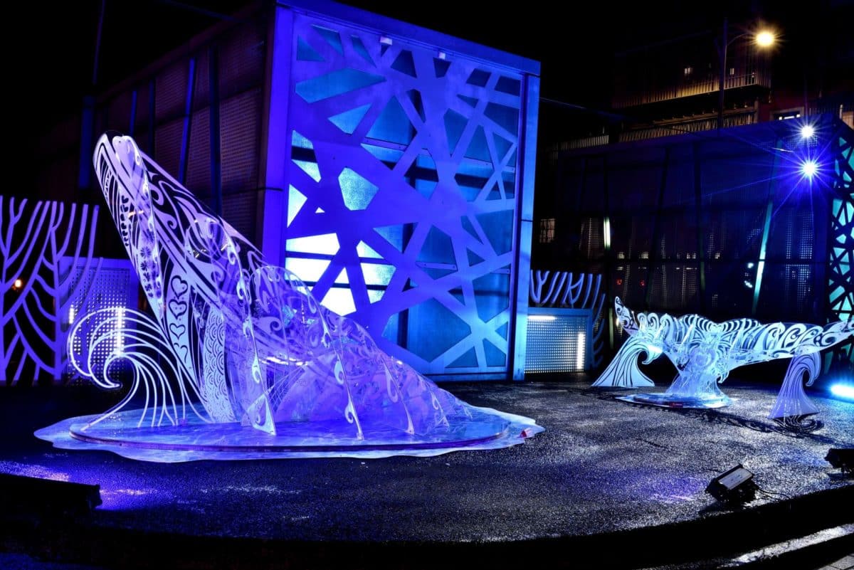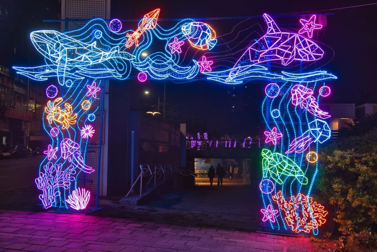 主燈「鯨夜躍您來」,採用沉浸式光影體驗,高達兩公尺的巨大鯨魚,探出水面向大家打招呼,營造身歷其境及浪漫炫麗的效果。「聲海魚雷」以雷射投影搭配鏡面裝置,將海底生物投射到牆面。走到「魟您開心」是以魟魚造型照明設備搭配水紋燈光投影,呈現海底眺望海面光影特效,非常絶美。