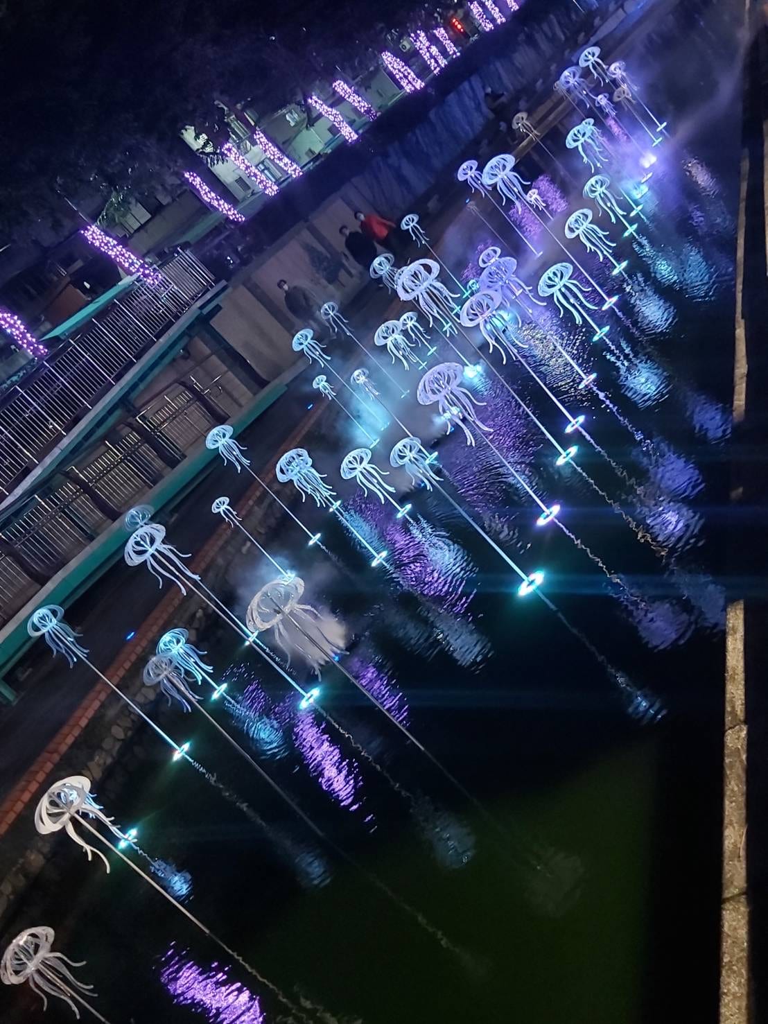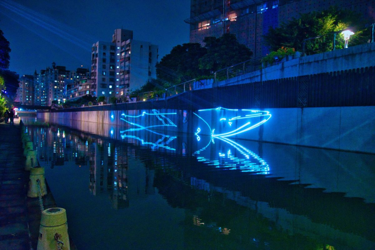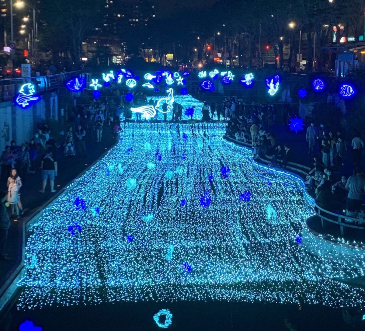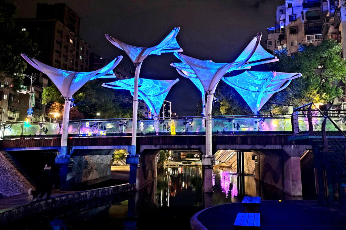 新莊中港大排過去是新莊地區工廠排放污水的人工大渠,還有在豪大雨時的防洪排水設施,政府仿效韓國首爾清溪川的診治,將它變成現況的親水公園。大家還記得在2020年在新莊造成轟動「幸福下一站-藍調中港」光雕秀嗎?那時候真的是深受大眾的喜愛,今年新北市政府水利局特聘2021新北歡樂耶誕城團隊製作《鯨彩中港》光雕秀,以海洋為題,展期從2022/2/11~3/18每晚18:00~22:00,最大亮點就是主燈高達兩公尺「鯨夜躍您來」吸睛巨大鯨魚,以及新莊宏匯廣場旁210秒的水舞秀,在今年各縣市陸續舉辦燈節以及櫻花季的到來,不妨來中港大排悠閒散步,一起感受海底世界的奧妙吧!