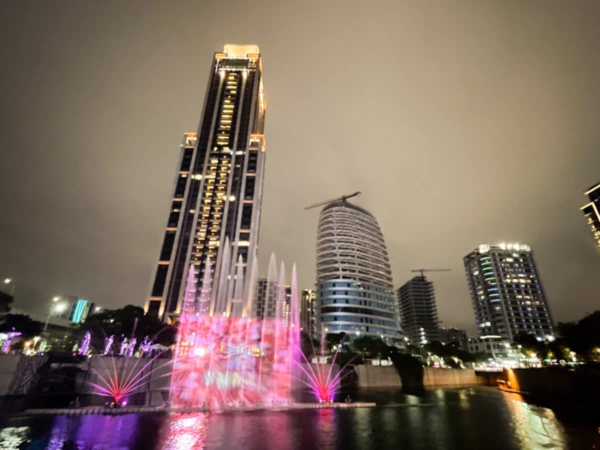 「2022新北鯨彩中港光雕展」,壓軸就是宏匯廣場旁願景公園,上演的「鯨彩中港」水舞秀,高達7公尺巨型水幕搭配雷射科技加上音樂,整整表演4分鐘,場面非常震撼無比。