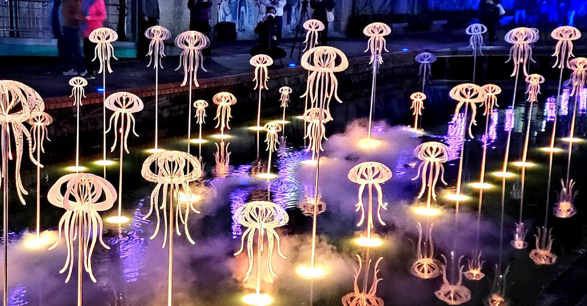 這次展區最受大家歡迎的無不就是水母排列的「母湯•嘸去」以及有幸福寓言的「幸福貝珍」。水母廊道「母湯•嘸去」由20個造型亮麗的水母錯落放置於水面,多樣的色彩變化,將河廊打扮的生動亮麗。「幸福貝珍」以貝殼與珍珠為主角,藉由水霧機營造煙霧繚繞,彷彿身處在仙境,難怪FB、IG上大家必拍這兩區!